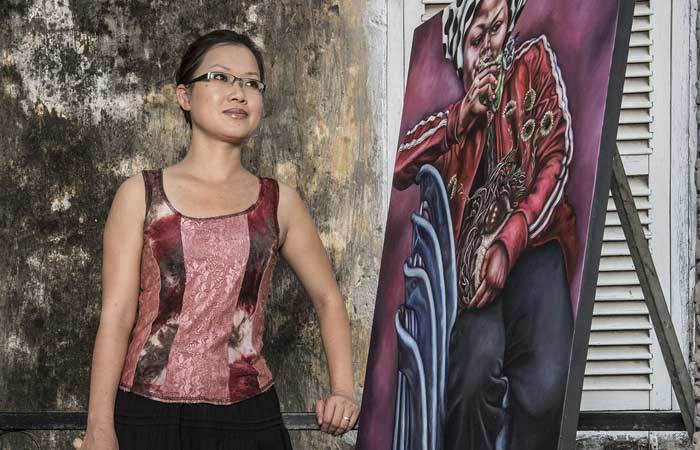 Sokuntevy OEUR (Tevy) is a Berlin-based female painter from Battambang, Cambodia who is boldly leading the charge of the country’s emerging women’s art movement. Tevy is certainly not afraid to speak her mind or ask questions. At the forefront of her practice is an impassioned personal search to determine where, as an independent woman and artist, she can identify herself within contemporary society. Her gender and professional status as an artist, coupled with her unrelentingly honest approach to her subject matter, are a rare and precious combination.